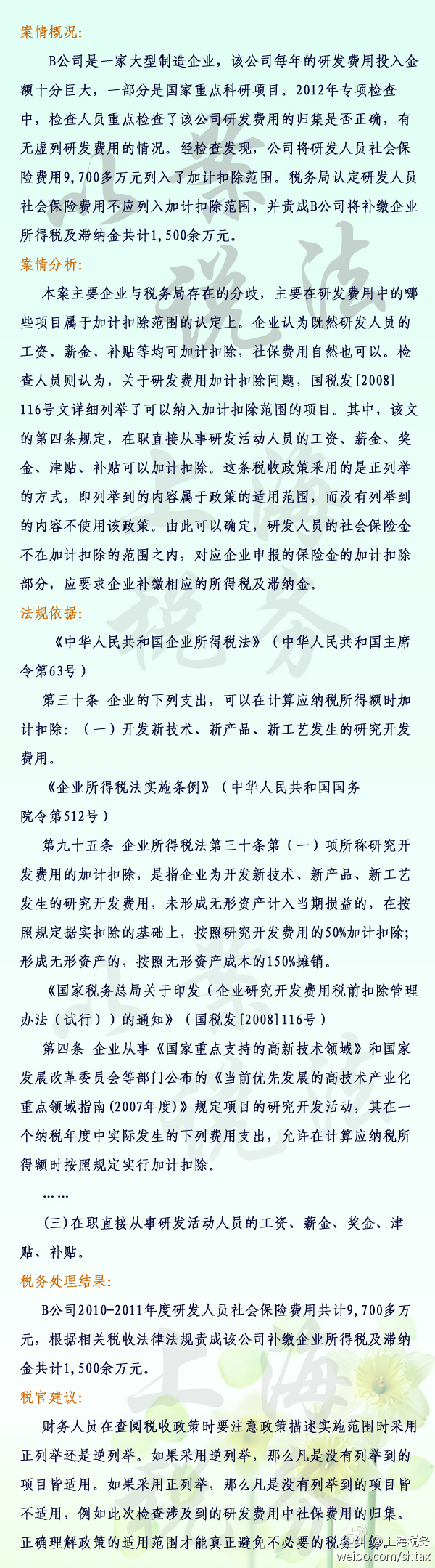 上海税务新浪微博日前发布的一则案例称,B公司将研发人员社会保险费用9,700多万元列入了研发费用加计扣除的范围,在
