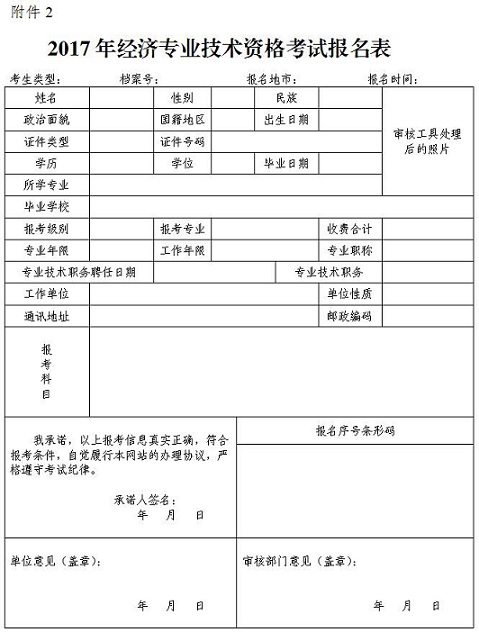 4.报名表打印。考生完成照片上传、信息填报和报名信息确认后,请下载并打印《2017年度经济专业技术资格考试报名表》(附件2,以下简称《报名表》)。由于报名使用全国统一网报系统,报名结束后,系统将不再支持《报名表》下载和打印。