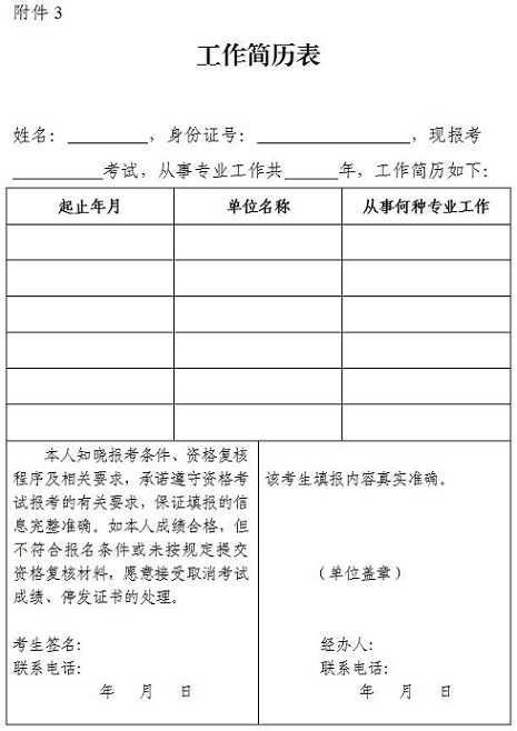 3.工作简历表(附件3)一份(考生从报名网站上自行下载,用A4纸打印,签名后经单位审核盖章)。