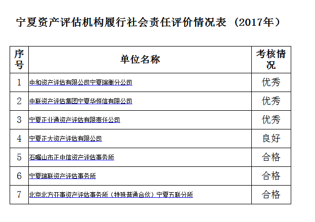 协会公示了《宁夏资产评估机构履行社会责任评价情况表(2017年)》,中和宁夏瑞衡分公司、中联宁夏华恒信有限公司、宁夏正业通等3家资产机构履行社会责任评价结果为优秀。