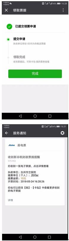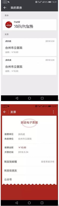 "微信不但能开电子发票,还能开财政的电子票据"。据悉,台州市立医院近日已可以领取电子票据。在台州财政局主导下,微信、航信和台州卫健委联合解决医疗电子票据交付"最后一里路"问题,打通患者就医挂号、就诊、交费、电子票据交付全闭环电子化管理。用户在缴费后,可把电子票据直接保存到微信卡包里,既方便归集保存,又方便线上报销。