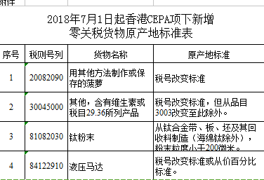 原产地标准表使用简化的货物名称,自2018年7月1日起执行。新增香港享受零关税货物的范围与《中华人民共和国进出口税则》(2018年版)中相应税则号列对应的商品范围一致。
