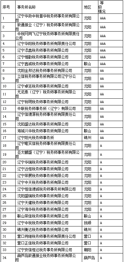 协会发布《关于2018年辽宁省等级税务师事务所的公示》,AAA级税务所7家、AA级税务所10家、A级税务所17家。