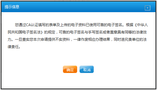 请仔细阅读提示信息,知晓CA证书的法律效力。如无问题,点击[确定]按钮继续操作。
