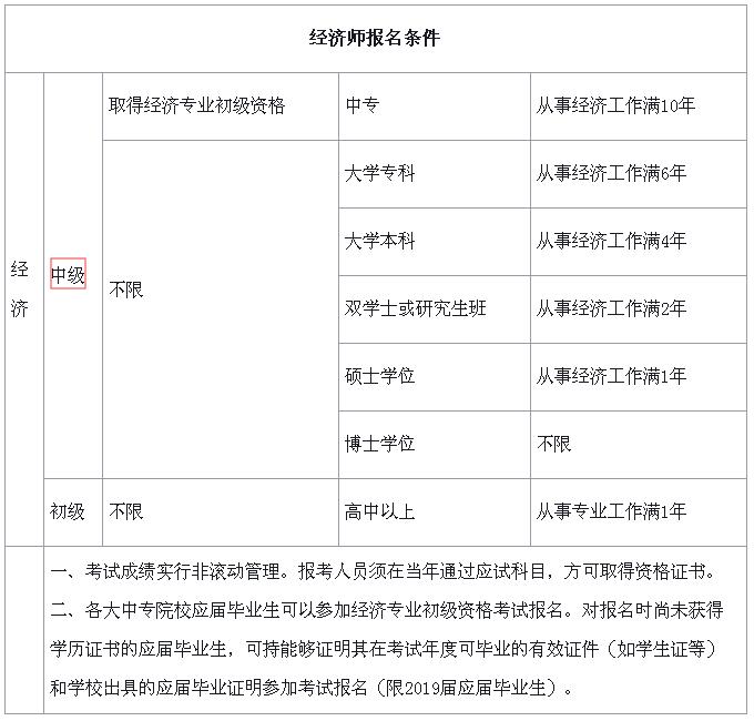 2020吉林中级经济师报名条件尚未公布,根据历年经验中级经济师报名条件不会有太大变化,考生可先参考19年中级经济师报考条件: