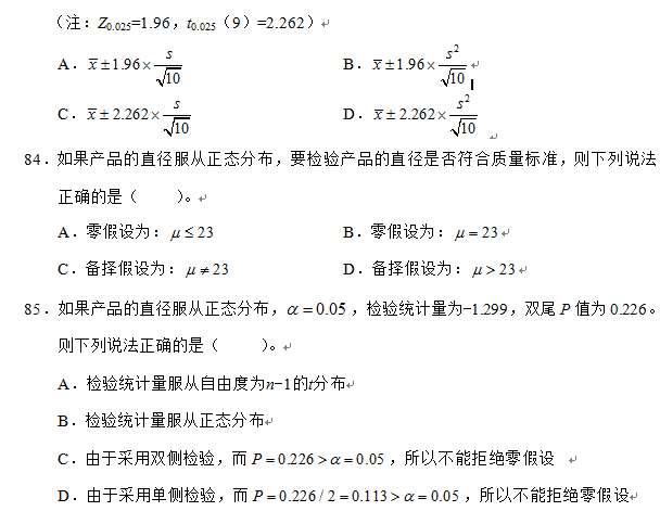 83.如果产品的直径服从正态分布, ,样本方差为 ,样本均值为 ,则生产线上该种产品平均直径95%的置信区间为( )。
