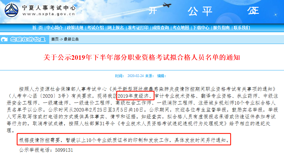 2019年宁夏初级经济师证书暂缓印制和发放工作