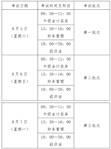 2、考试时间、地点。中级考试定于2020年9月5-7日举行,共3个批次。其中《中级会计实务》科目考试时长为3小时,《财务管理》科目考试时长为2.5小时,《经济法》科目考试时长为2小时。考试地点:宁德市中心城区(具体地点以准考证上信息为准)。