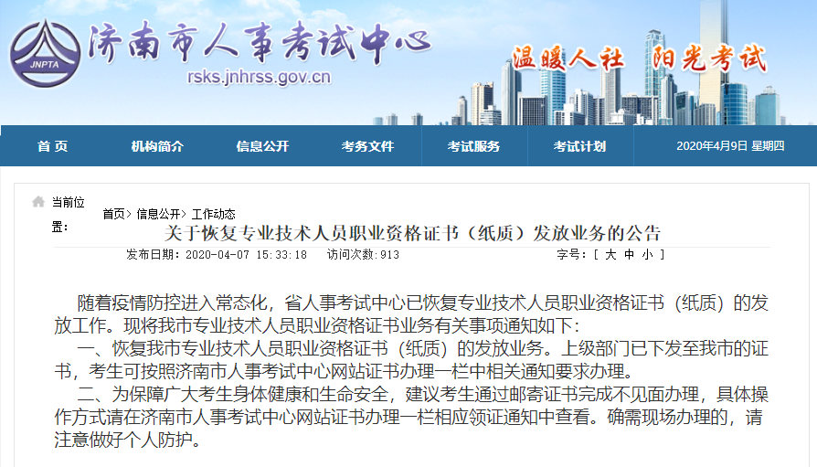 一、恢复我市专业技术人员职业资格证书(纸质)的发放业务。上级部门已下发至我市的证书,考生可按照济南市人事考试中心网站证书办理一栏中相关通知要求办理。