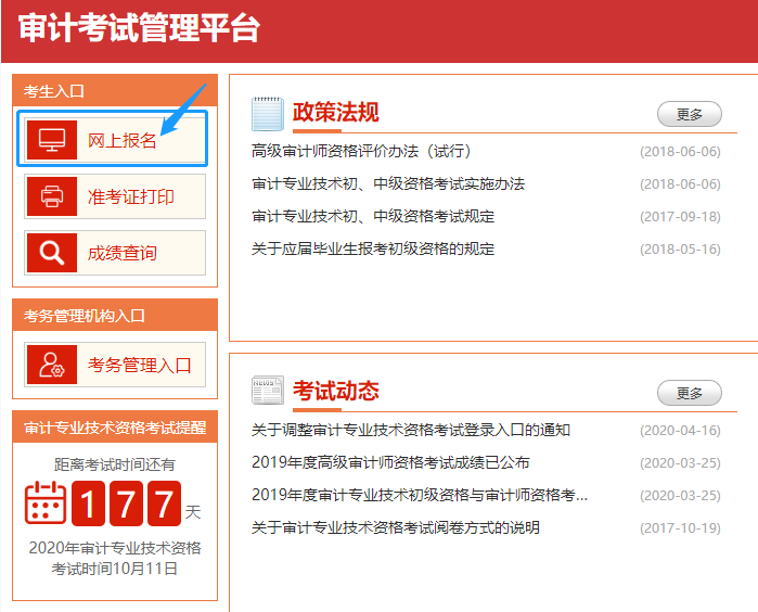 自2020年起,“审计考试管理平台”登录入口设在审计署门户网站(www.audit.gov.cn)导航栏“公共服务”栏目下“审计考试”项目。这就意味着原来直接进入中国审计数字在线网进行报名的历史过去了,从2020年开始想要报名审计师考试的考生要遵循以下流程: