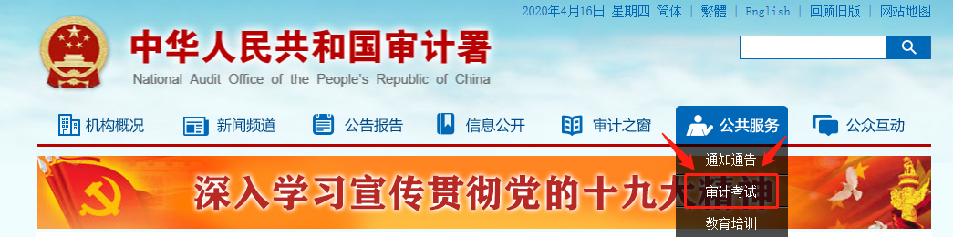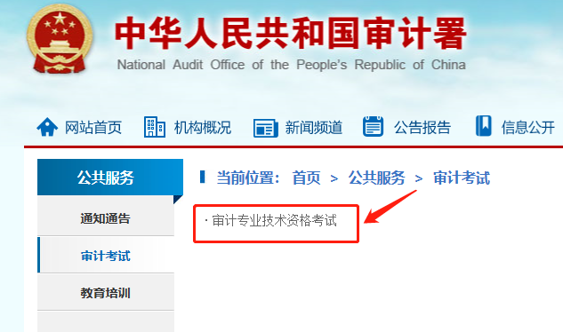 1.进入审计署门户网站(www.audit.gov.cn),在公共服务栏目下找到审计考试。