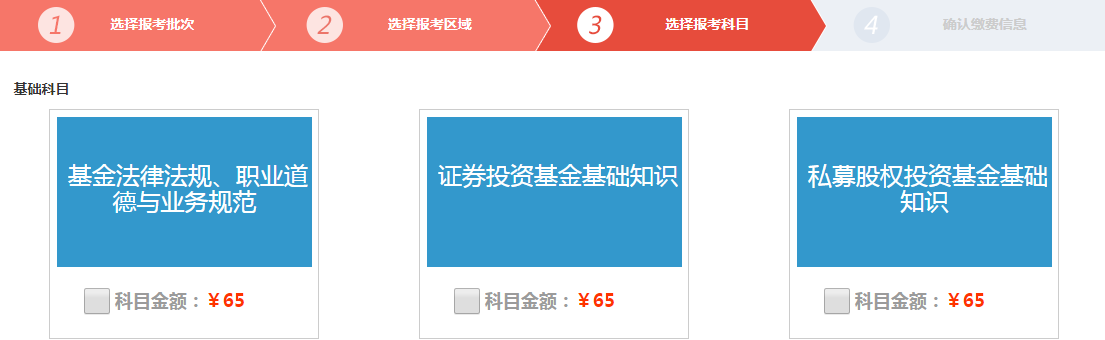 基金从业资格考试一共有三个科目,分别是科目一《基金法律法规职业道德与业务规范》、科目二《证券投资基金基础知识》、科目三《股权投资基金基础知识》。考试费用是65元/科,包括报名费用和考务费用,学员在网上报名时进行在线缴费,缴费成功即报名成功。