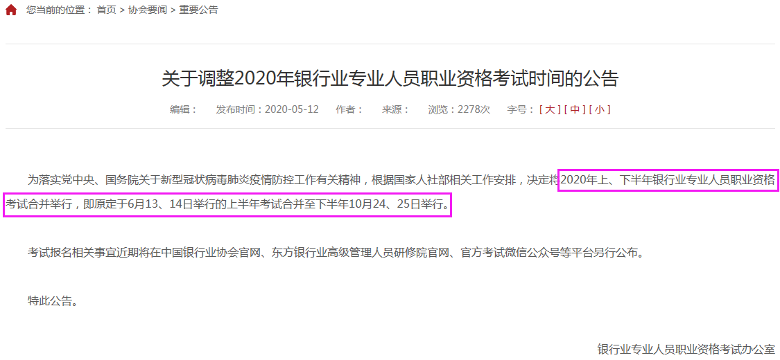当你还在关心2020年证券从业资格考试报名时间什么时候公布的时候,又一考试官宣取消举行了!5月12日,中国银行业协会发布《关于调整2020年银行业专业人员职业资格考试时间的公告》,将2020年上、下半年银行从业资格考试合并举行,即原定于6月13、14日举行的上半年考试合并至下半年10月24、25日举行。