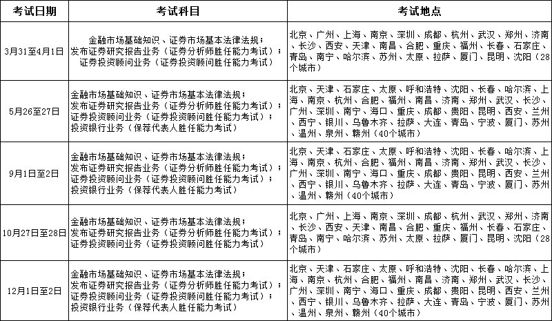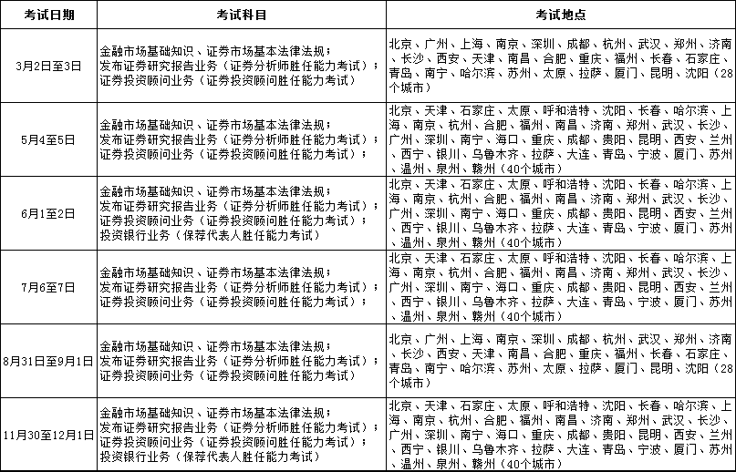 2020年证券从业资格考试时间安排,全年五次,考试安排如下图: