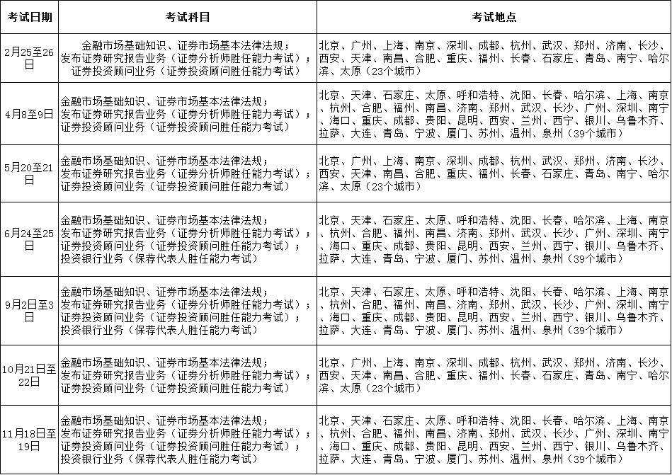 2019年证券从业资格考试时间安排,全年六次,考试安排如下图: