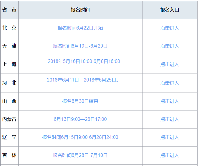 2018年各省初级统计师报名时间5月-7月,部分省市报名时间截图如下