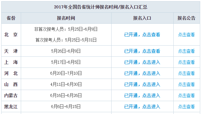 2017年各省初级统计师报名时间4月-7月,部分省市报名时间截图如下