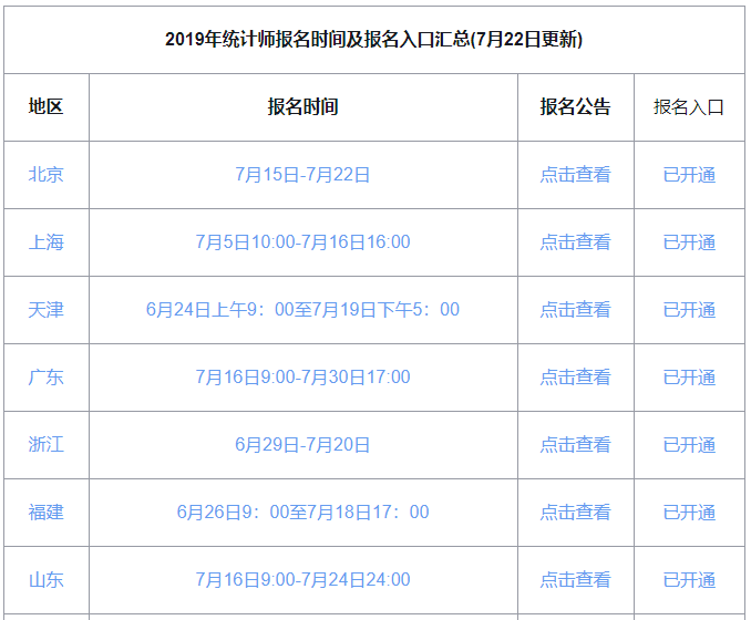 2019年各省初级统计师报名时间6月-7月,部分省市报名时间截图如下