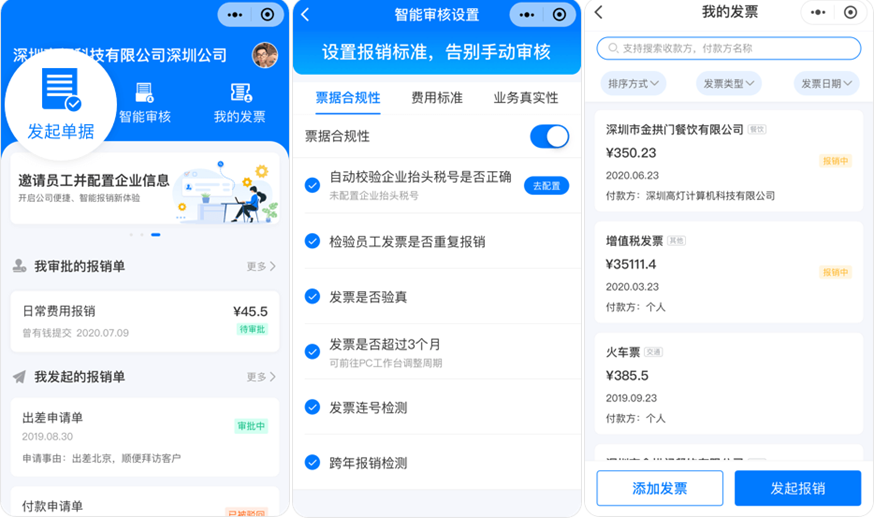 为解决这一痛点,高灯微报销通过费用管理SaaS云平台打通了“费用-报销-入账”全流程,员工通过微信小程序申请报销,系统根据发票数据即可自动生成报销单,实现员工免填单,从此不再担心填单出错问题;财务审核单据时,系统自动审核报销单据的业务真实性、费用控制和票据合规,实时反馈风险问题,电子凭证即时归档,为财务节省审单时间,带来查验去重100%准确的放心体验,帮助企业实现从纸质到电子报销的数字化升级,让员工省事、财务省心,为企业降本提效。同时,