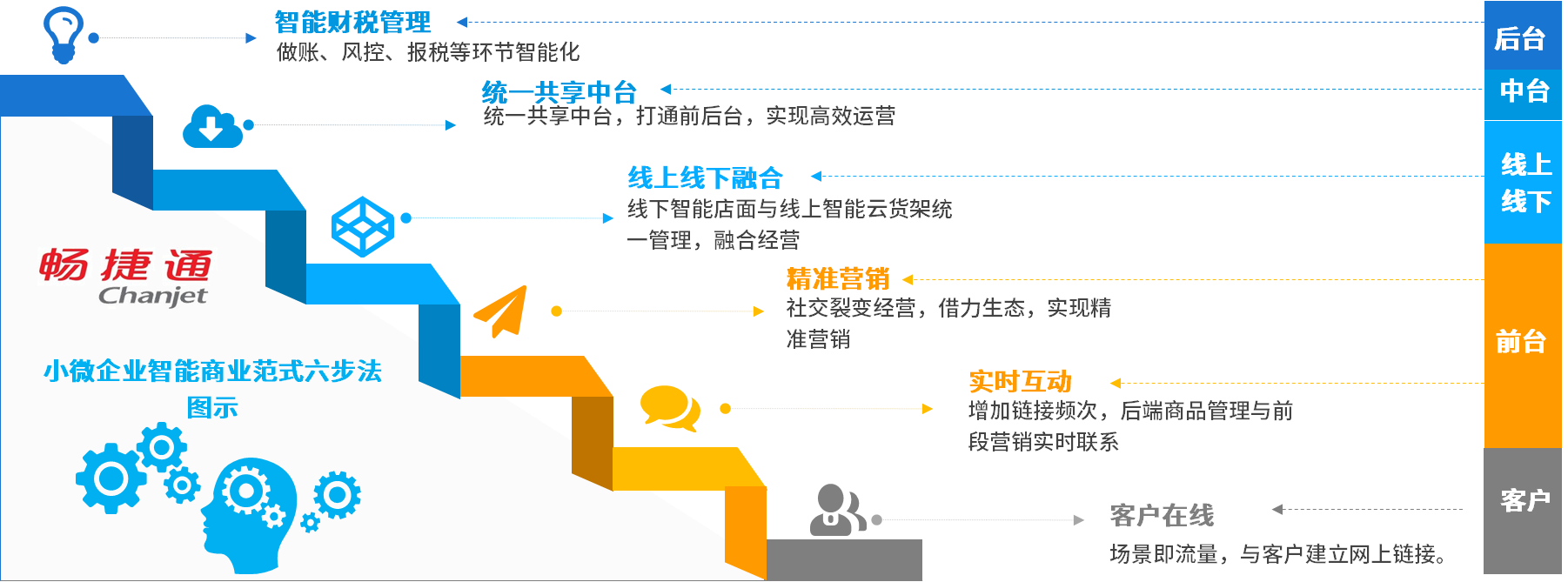 “智能商业范式六步法”由畅捷通首次提出,主要包含六大方面:一是遵循场景即流量,实现客户在线。从客户在场景内消费就建立起与客户的线上联系,基于多维度线上通道实现小微企业私域流量的经营;二是打破空间限制,实现与客户实时互动。通过增加与客户的连接频次,精准为客户提供兴趣商品、服务,有效提升客户留存复购率和客单价;三是社交裂变经营,借力生态,精准拉新。基于老客和区域角度,实现社交裂变经营,借助生态,实现精准、快速营销拉新;四是线上线下深度融合,实现消费体验闭环。线下智能店面、线上智能云货架统一管理、深度融合,营销、消费、支付、提货、发货等一体化经营;五是统一共享中台,提升运营效率。统一共享中台,实现价格、促销、货管等方面统一管理,有效降低库存、减少管理冲突,提升整体运营效率;六是智能财税管理,实现财税可持续发展。实时、快速、规范有效降低财税风险,帮助小微企业实现财税健康可持续发展。