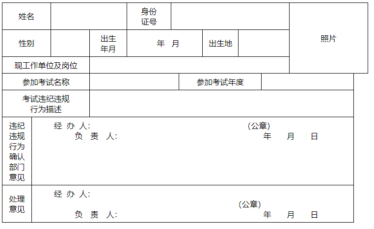 建立失信应试人员黑名单制度,加大失信联合惩戒力度,加强跨部门联动响应。失信行为记入专业技术人员资格考试诚信档案库,诚信档案库的失信应试人员纳入全国信用信息共享平台,完善“一处失信、处处受限”的联合惩戒机制。失信应试人员信息将视情况向社会公布或通报,并通知当事人所在单位,《个人诚信失信记录单》(附件2)放入个人档案,涉嫌犯罪的,移送司法机关处理。