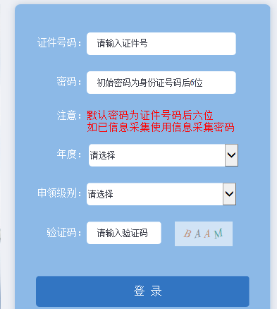 2.申请人输入身份证号码、年度、申请级别及验证码后,系统将自动校验是否为有效申请人,待校验为有效申请人后进入证书申领表页面。