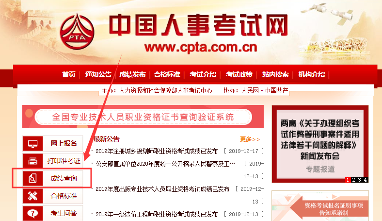 1.进入中国人事考试网:http://www.cpta.com.cn/,找到成绩查询栏目,点击进入。