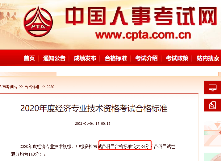 中国人事考试网:2020中级经济师各科目合格标准均为84分