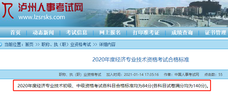 2020年度经济专业技术初级、中级资格考试各科目合格标准均为
