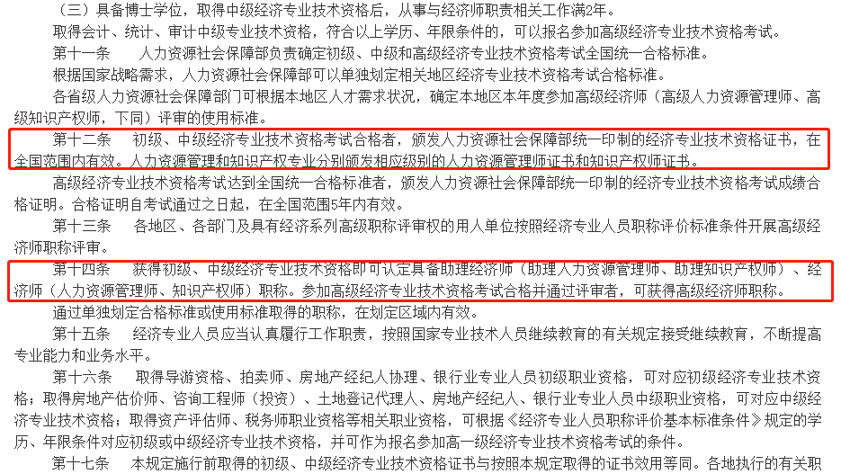 其中确定规定:初级、中级经济专业技术资格考试合格者,颁发人力资源社会保障部统一印制的经济专业技术资格证书,在全国范围内有效。人力资源管理和知识产权专业分别颁发相应级别的人力资源管理师证书和知识产权师证书。
