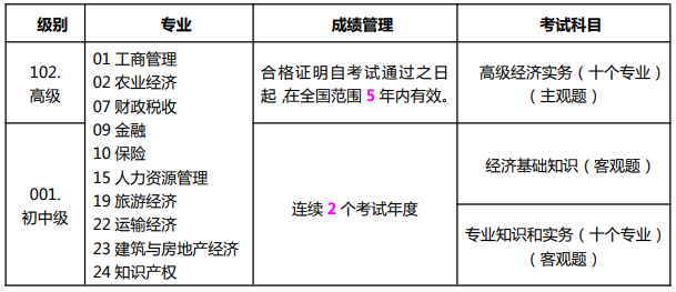 【成绩管理】经济专业技术资格考试高级考试,达到全国统一合格标准者,颁发人力资源社会保障部统一印制的经济专业技术资格考试成绩合格证明。合格证明自考试通过之日起,在全国范围 5 年内有效。初中级考试的应试人员须在连续的 2 个考试年度内通过全部应试科目(具体参阅表一)。