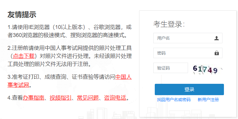 一、打开中国人事考试网点击左侧的网上报名,进入登录页面;或是直接点击下图进入登录页面。输入用户名、密码、验证码进行登录。(点击下图直接进入报名入口)