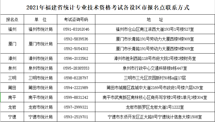 2021年福建省统计专业技术资格考试各设区市报名点联系方式