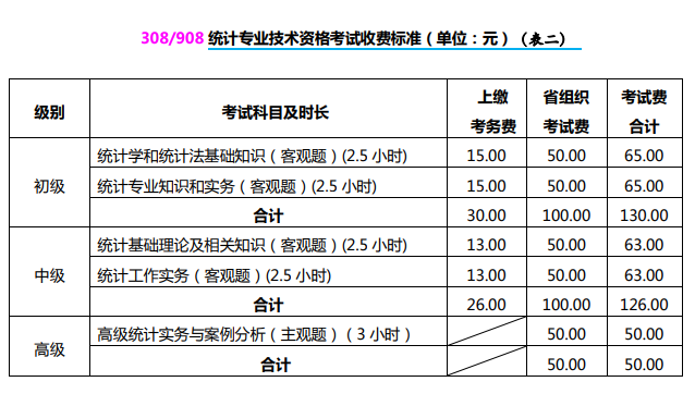 【收费标准】按照《关于统计专业技术资格考试收费有关问题的通知》(统考办字〔2016〕1 号)《山西省发展和改革委员会 山西省财政厅 关于改革全省专业技术人员职业资格考试收费标准管理方式的通知》(晋发改价格发〔2020〕563 号)执行(具体见表二),收费票据由山西省人事考试中心负责发放。