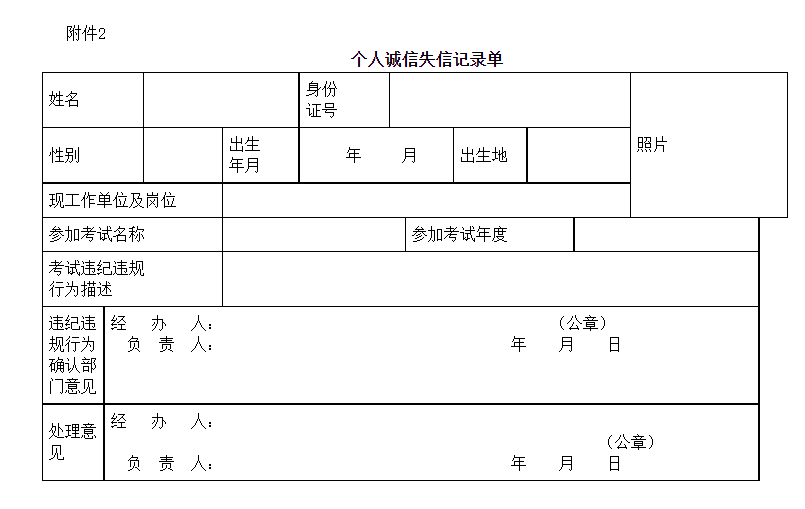 建立失信应试人员黑名单制度,加大失信联合惩戒力度,加强跨部门联动响应。完善“一处失信、处处受限”的联合惩戒机制,失信行为记入专业技术人员资格考试诚信档案库,诚信档案库的失信应试人员纳入全国信用信息共享平台。失信应试人员信息将视情况向社会公布或通报,并通知当事人所在单位,《个人诚信失信记录单》(附件2)放入个人档案,涉嫌犯罪的,移送司法机关处理。