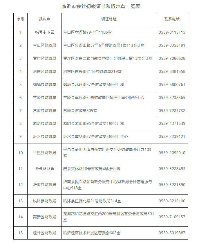 附件:临沂市会计初级证书领取地点一览表