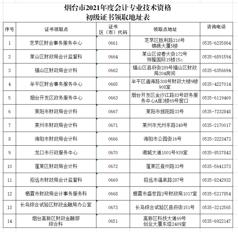 附件: 1.烟台市会计初、中级证书领取地点统计表