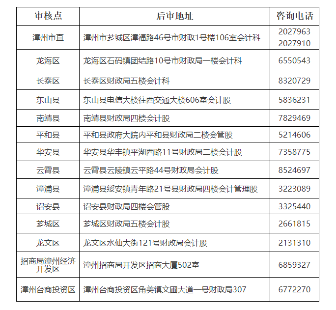 漳州市直、各县、区、漳州台商投资区、招商局漳州经济开发区现场审核地点、联系电话如下: