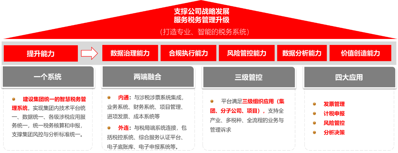 用友BIP税务云采用先进的技术和架构,打破建企内外部系统孤岛,以项目为主线,以业务为源头,数据为桥梁,实现集团层税务高效管控: