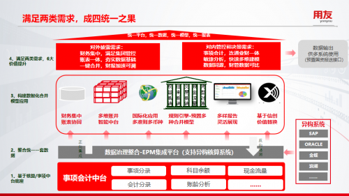 用友BIP 报告及合并在事项会计的加持下已完全实现精准合规的目标,完全可以满足全口径的披露要求、数据可信、查询灵活、可一键生成合并报表、可一键执行异构数据集成、可满足各类对账场景。