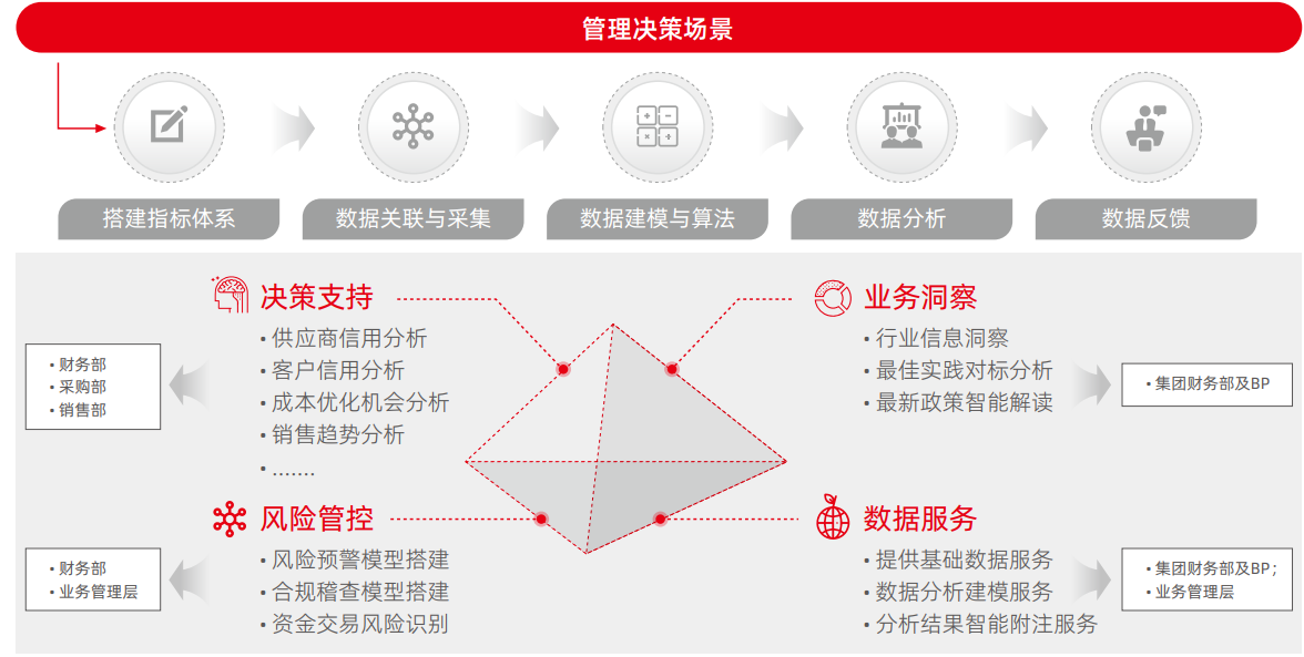 数据赋能管理决策场景:数智共享数据服务平台在事项会计中台支撑之下,集合全域数据(业务专业数据、共享数据以及 社会化数据),构建数据指标及价值体系、算法和分析模型,实现不同管理视图的数据指标分析结果展示;应用神经网络或者机器学习等智能化技术进行数据挖掘和处理,实现预测与预警。通过财务共享中心的数据沉淀,未来帮助企业构建财务数字能力,以数据洞察驱动经营决策,为企业数字化转型赋能。