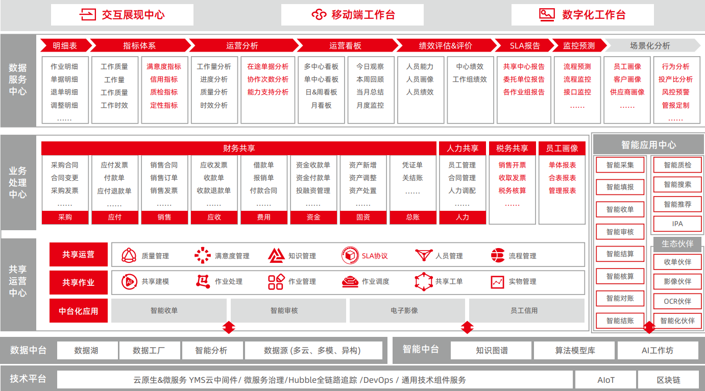 从业务处理、共享运营到数据服务:共享业务处理中心全面集成前端业务,实现全业务链接、通过标准化作业达成合规管控和降本增效;数据中台进行过程数据沉淀并传递至数据服务中心,完成数据资产化服务,推动共享中心达到风险防范和数据赋能;共享运营中心致力于建设共享中心领先管理体系,不断推动共享中心迈向卓越运营中心,实现持续创新能力。