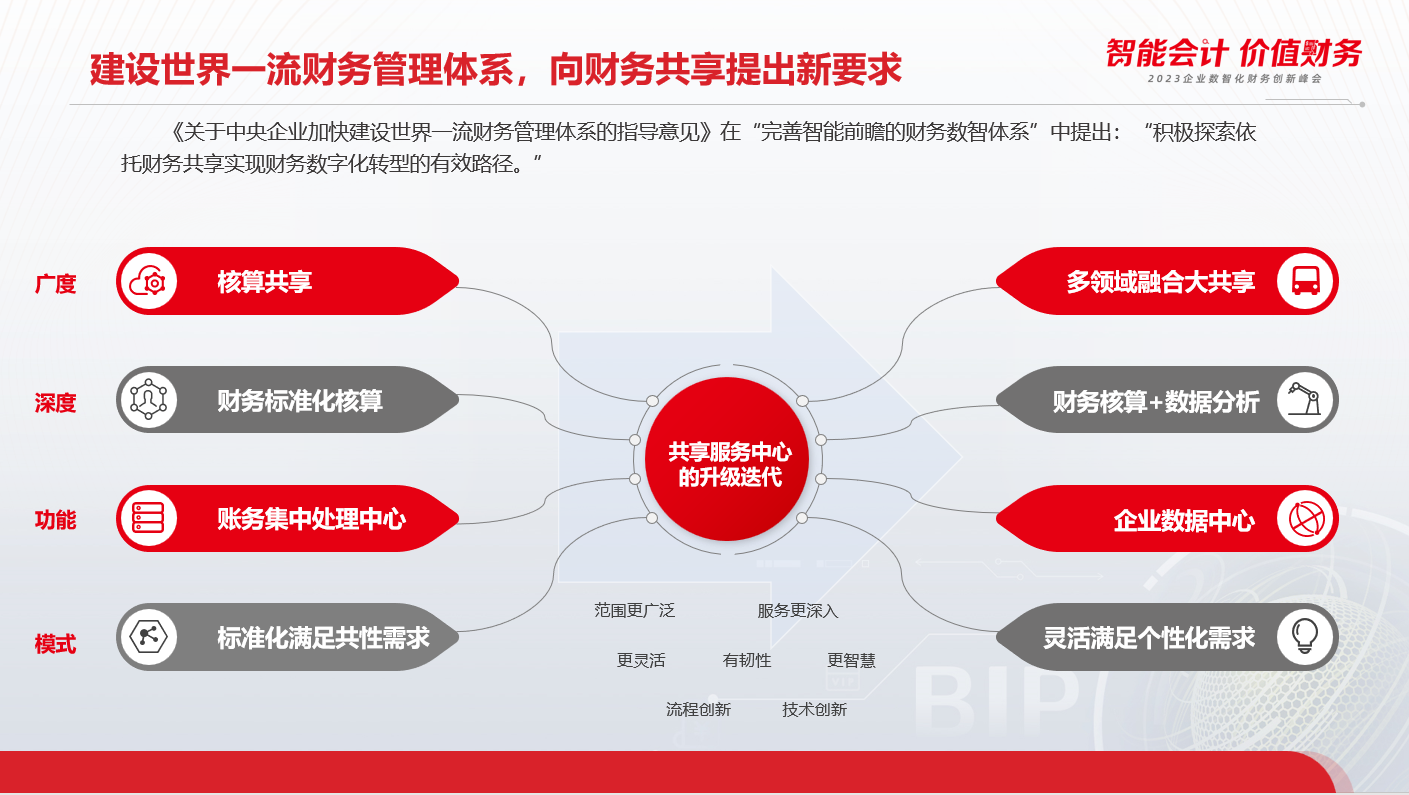 业务深化:在数智化大共享,业务范围从核算共享,将共享模式不断深化至管理会计、合并报表、全面预算、全球司库、精准税务的领域,推动价值转型。