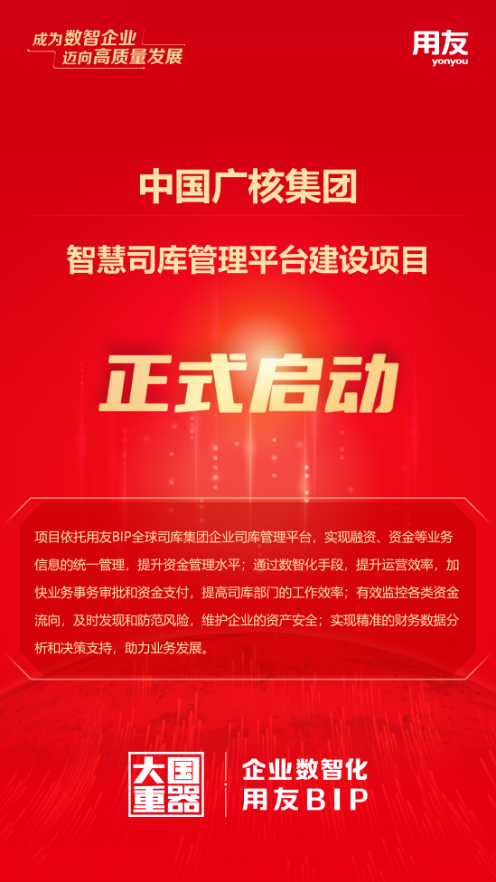 近日,由用友承建的中国广核集团(简称:中广核)智慧司库管理平台建设项目启动会在双方领导的见证下隆重召开。中广核财务资产部总经理、财务公司董事长罗军,中广核财务公司总会计师陈德邵等客户方领导,用友网络高端BG总裁何强,用友网络副总裁李建敏,用友网络助理总裁尹纪海等用友方领导及双方项目组成员出席本次会议。