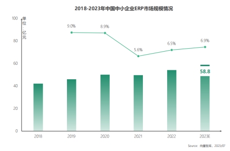 向量智库分析认为,伴随中小企业复苏,中小企业ERP市场攀至58.8亿,复合年均增长率接近7%,整体市场逐步回归上升通道。但另一方面ERP在整个中小企业市场中的渗透不足10%,其中ERP在制造行业渗透相对快速,衍生出大量细分行业解决方案,同时也预示着整体市场仍有较大的增长空间。