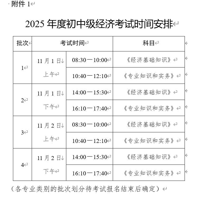 2025年度初级、中级经济专业技术资格考试形式为电子化考试(即机考),考试分2天,上、下午共4个批次实施(附件1)。各级别及专业类别的具体批次划分和考试时间,视报名情况另行确定。