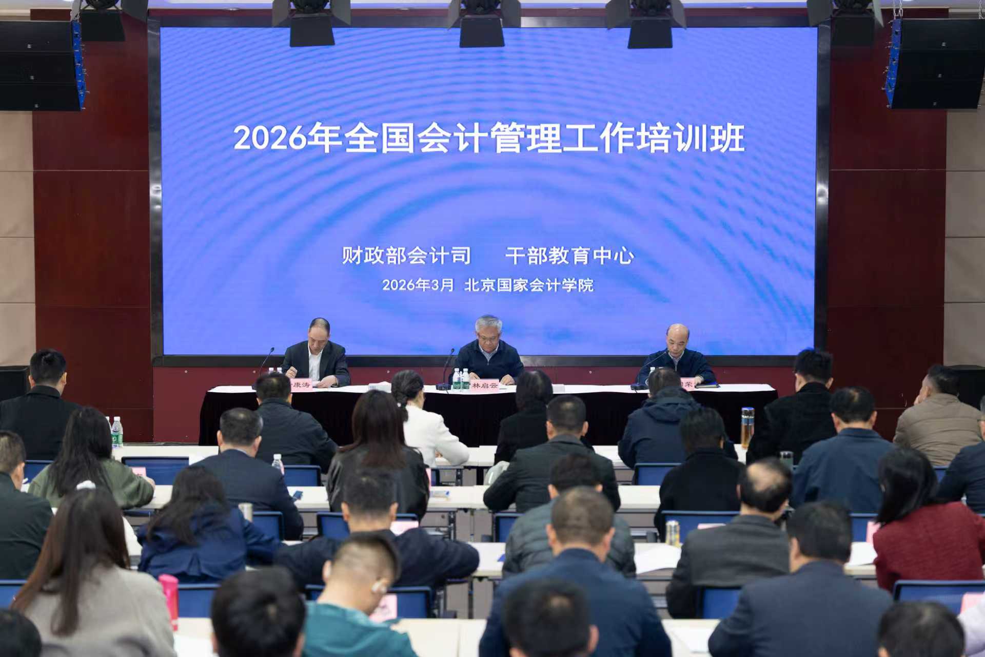 3月24—26日,财政部会计司与干部教育中心在北京国家会计学院联合举办2026年全国会计管理工作培训班。财政部会计司司长林启云,干部教育中心副主任刘国荣,北京国家会计学院党委副书记、院长叶康涛出席开班式。